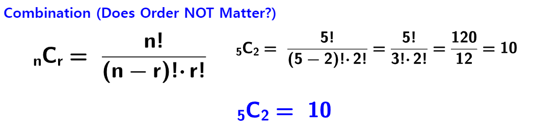 - 서로 다른 n개 중 r개를 순서 없이 선택하는 것