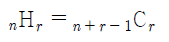 - 서로 다른 n개 중 r개를 순서를 고려없이 선택하는데 이미 선택한 것을 중복해서 선택하는 것을 허용